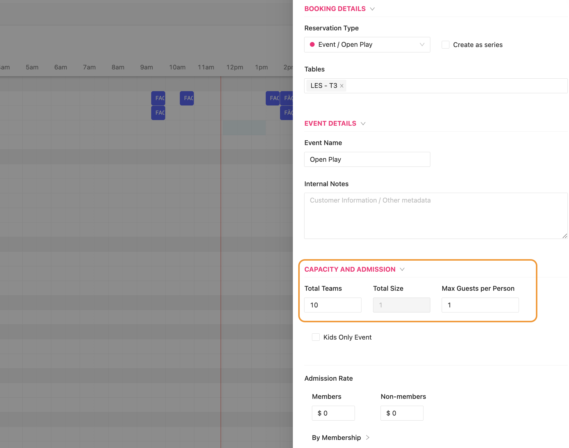 An Admin can limit the number of Customers who participate in an Event within the Event settings. By writing the preferred number into the “Capacity and Admission” section during the Event creation flow, the total participants will be capped.