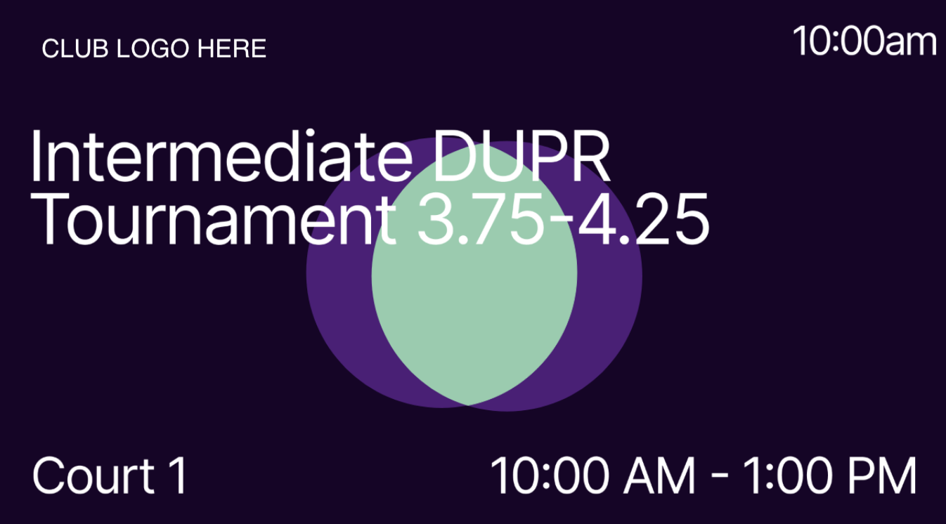 Below is what the Scoreboard looks like for an Event booked on the court, and the two circles are an animation that move across the Scoreboard’s screen