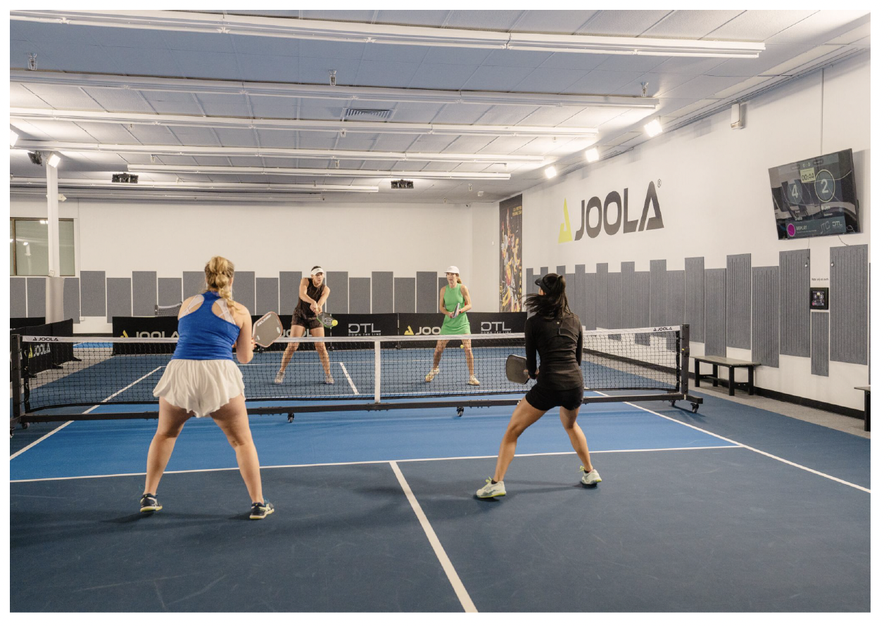 As the participants on the court are playing a game, they can click on the Play Buttons on their wrists or in their pockets to toggle points on the kiosk, which is pushed to the monitor.