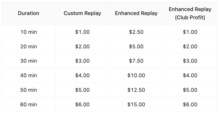 Processing cost: $0.15/min is the floor price. You cannot set your Enhanced Replay rate below this.