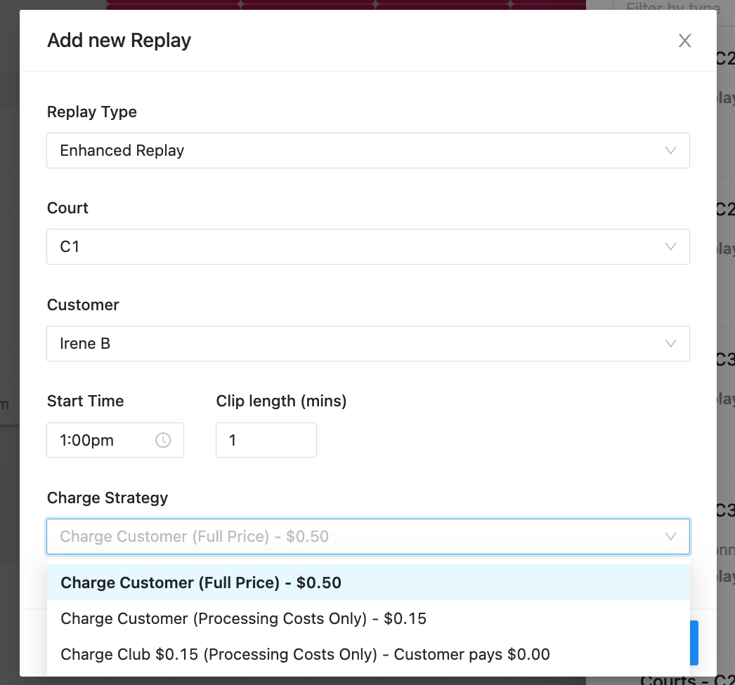 Custom Replays are full-length video clips of the session that players order from their past bookings. There is currently no processing cost to the club for Custom Replays, 100% of revenue from Custom Replay sales goes directly to you. We recommend starting at $0.10/min ($6.00/hr).