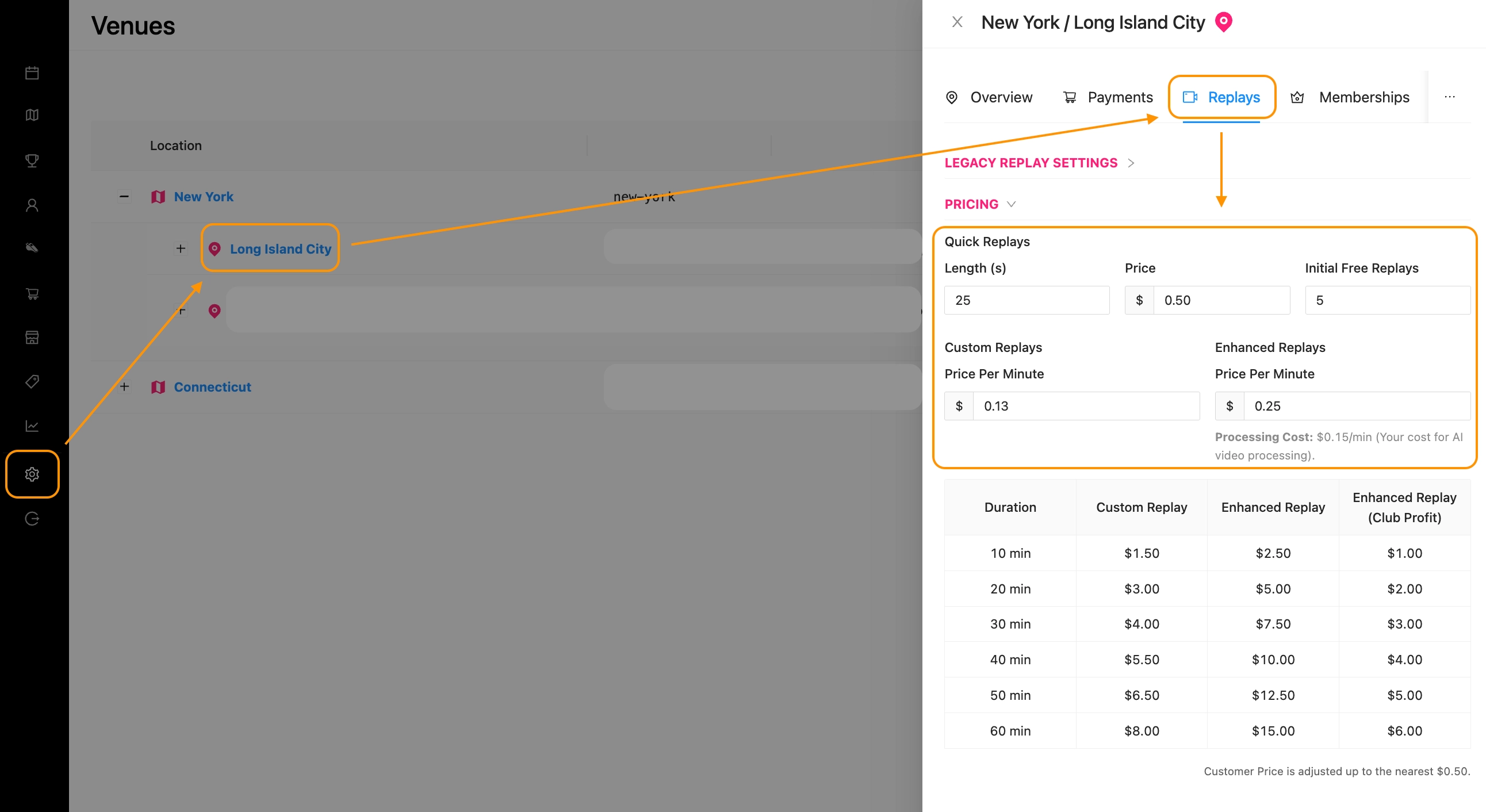 In the future: To configure your replay pricing, log in to your environment’s Dashboard and navigate to the Venue page > select the venue location > click on the Replays tab of that venue. You'll see fields for: