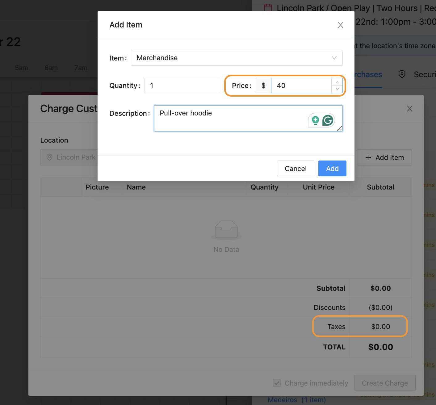 The line item for taxes will be visible and change depending on the cost of the item an Admin is manually charging, before completing the charge.