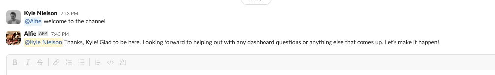 Alfie is also inside of joint Slack channels, available to answer any questions by tagging @alfie and asking a question