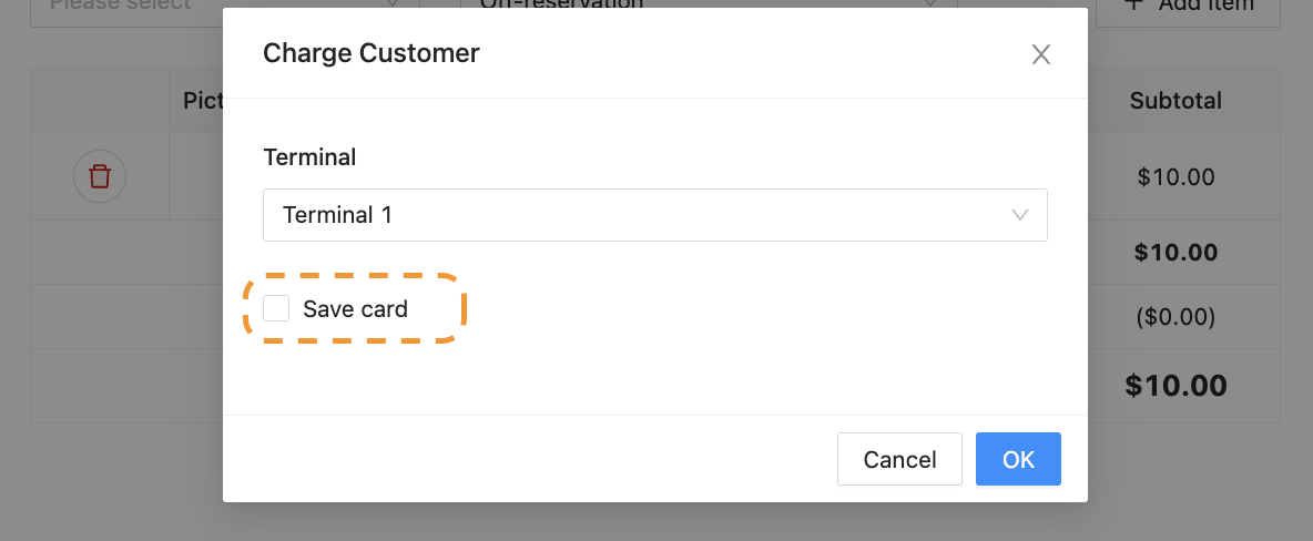 Should the Customer want to complete the purchase and store their CC in the same action, the Admin will need to select the “Save card” box