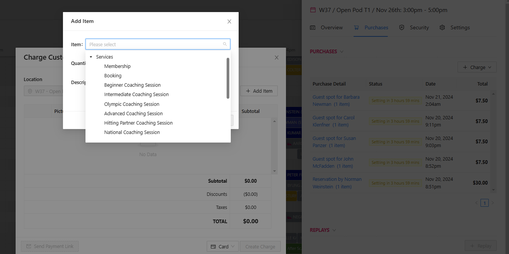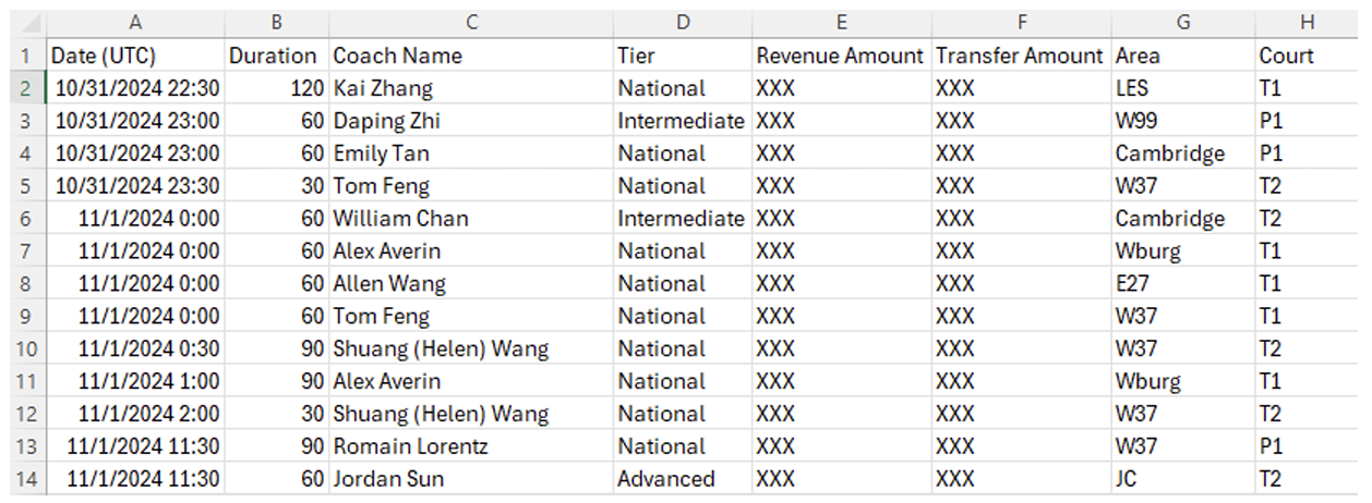 The PodPlay system records all of your Coaches’ private lessons (Reservations) and Clinics (Events). On the admin dashboard, navigate to your Coach Page → Export Button → Select the time frame. One file will download to your computer for all Coach lessons (Reservations & Clinics).