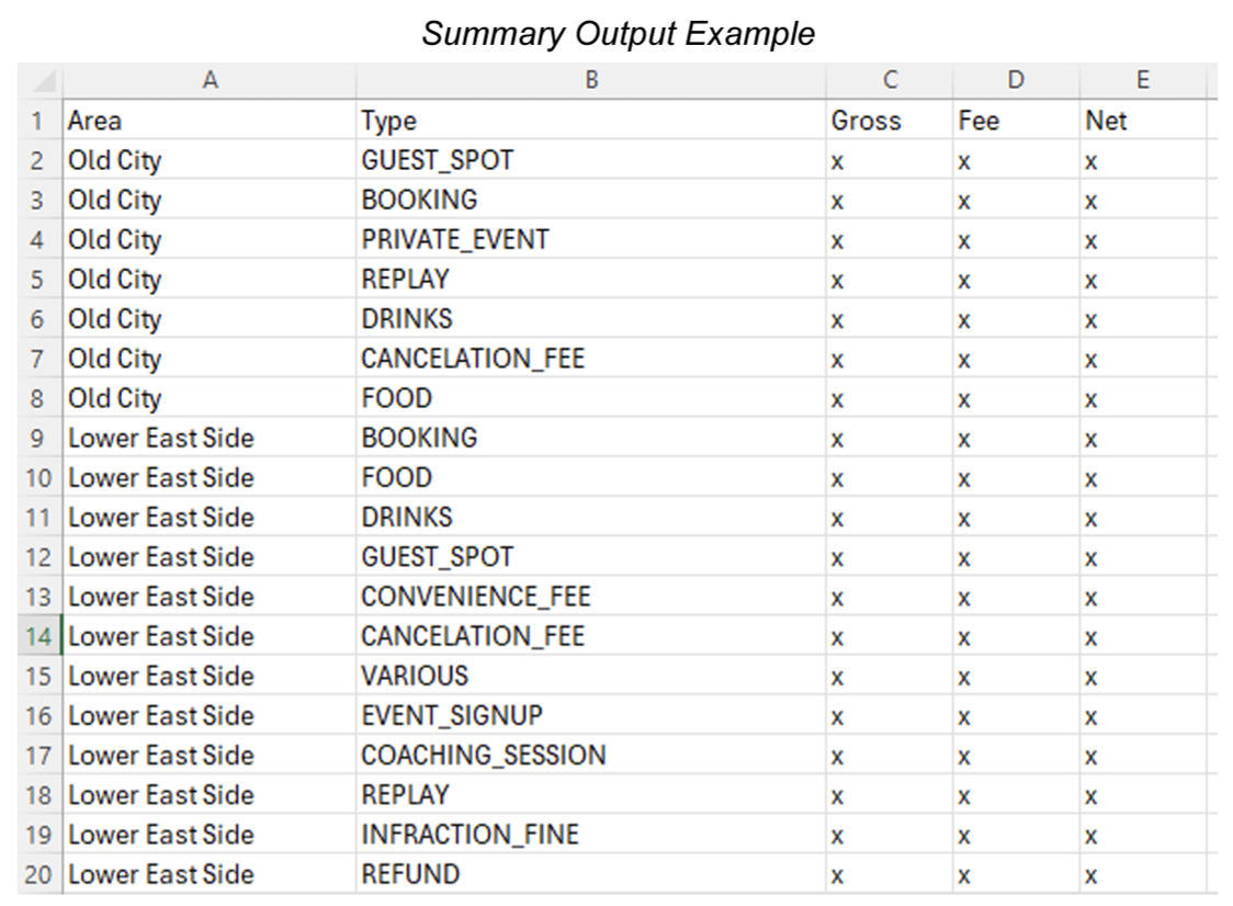The Summary Sheet is a concise overview of your transaction revenue grouped by revenue category (Bookings, Event Signups, Membership, etc) as well as by location. The summary sheet is useful for a quick overview of your revenue categories and total revenue for a given period.