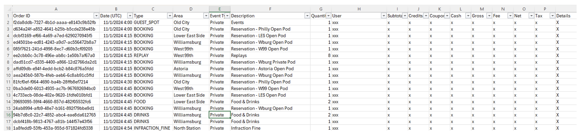 On the admin dashboard simply navigate to your Purchases Page → Export Button → Select the time frame. Two files will upload; a “Summary” file and a “Comprehensive” file.