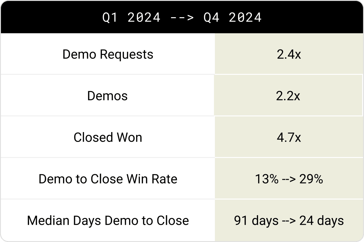 As can be seen in the below table, in 2024 we were able to more than double our top of funnel throughput, while also more than doubling our win rate, and reducing our time-to-close by 75%.