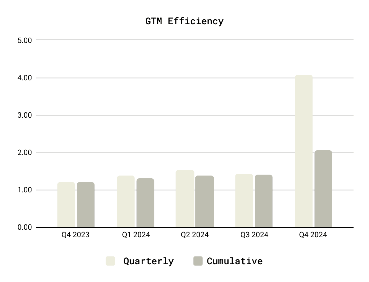 Our favorite all-in metric to measure the effectiveness of this strategy is the GTM Efficiency Ratio. This metric compares Net New Contracted ARR (CARR) in the quarter to the amount we spent on Sales & Marketing. In Q4 2024, we generated more than $4 of Net New CARR for each $1 spent on Sales & Marketing. By comparison, one analysis of public SaaS companies showed that the median company in Q3 2024 was generating $0.40 of Net New ARR for each $1 spent on Sales & Marketing.