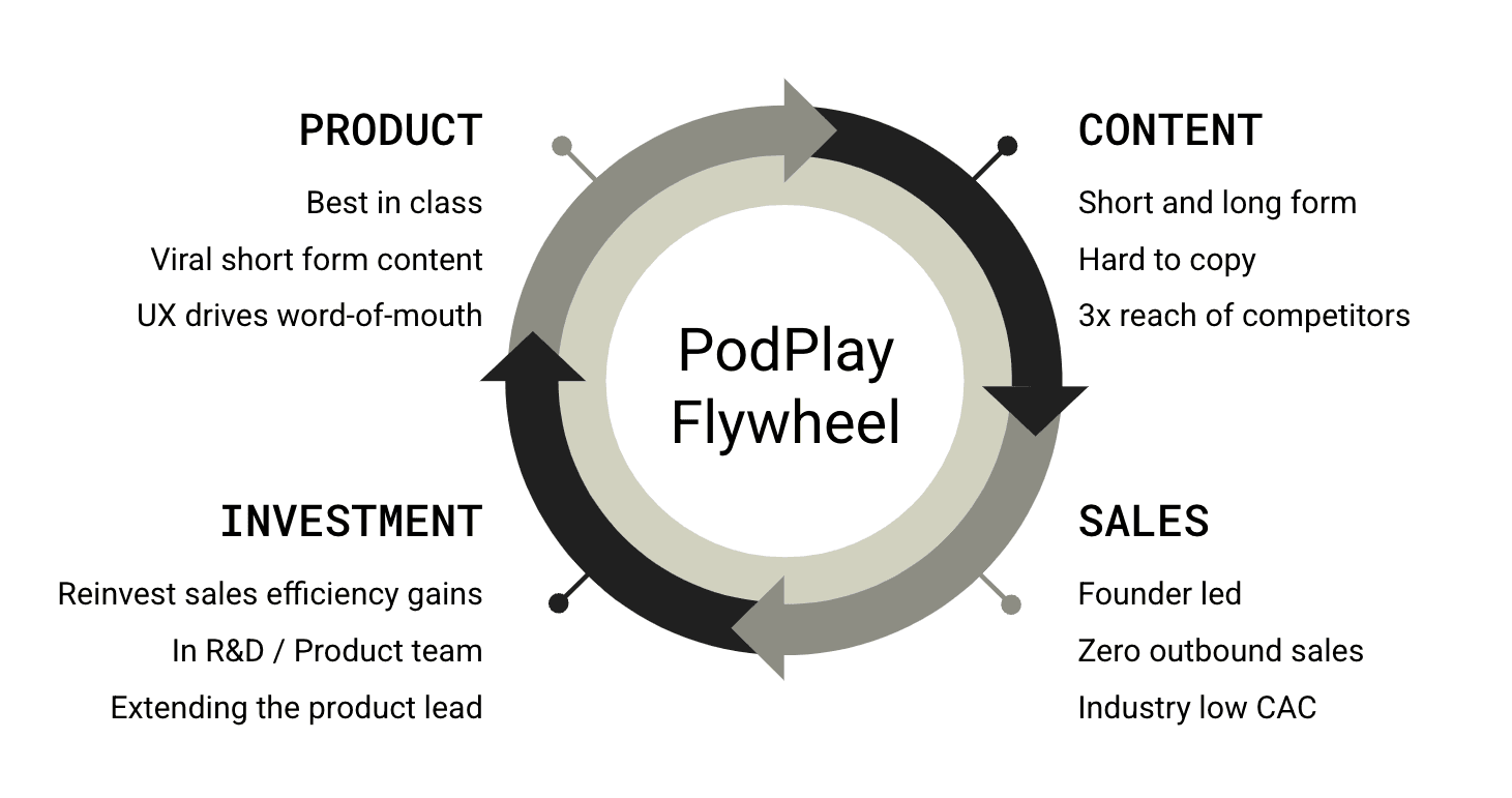 PodPlay’s Go-to-Market (GTM) motion couples content-based lead generation with founder-led sales. Digital content is highly scalable AND becomes a form of relationship building at scale. Our goal is to have the best product and the best content. If we can do that, we will have a highly efficient GTM motion that allows us to reinvest in R&D that in turn increases our product lead.