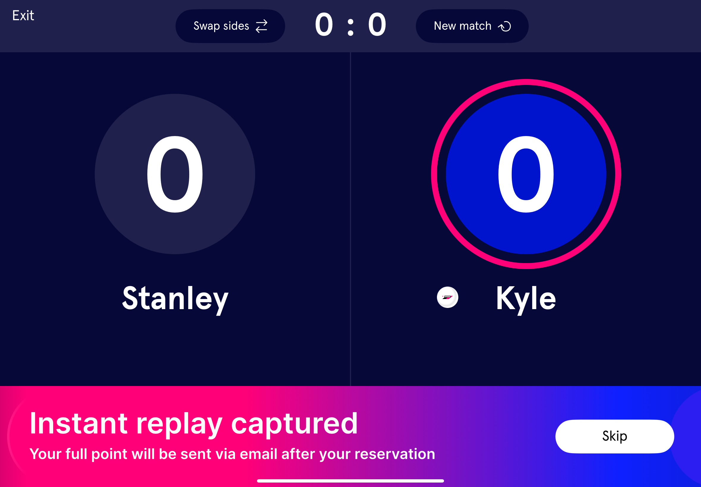 If a Customer clicks on the “Skip” button in the bottom right of the kiosk, the Instant Replays WILL NOT SHOW for the duration of the Reservation or Event