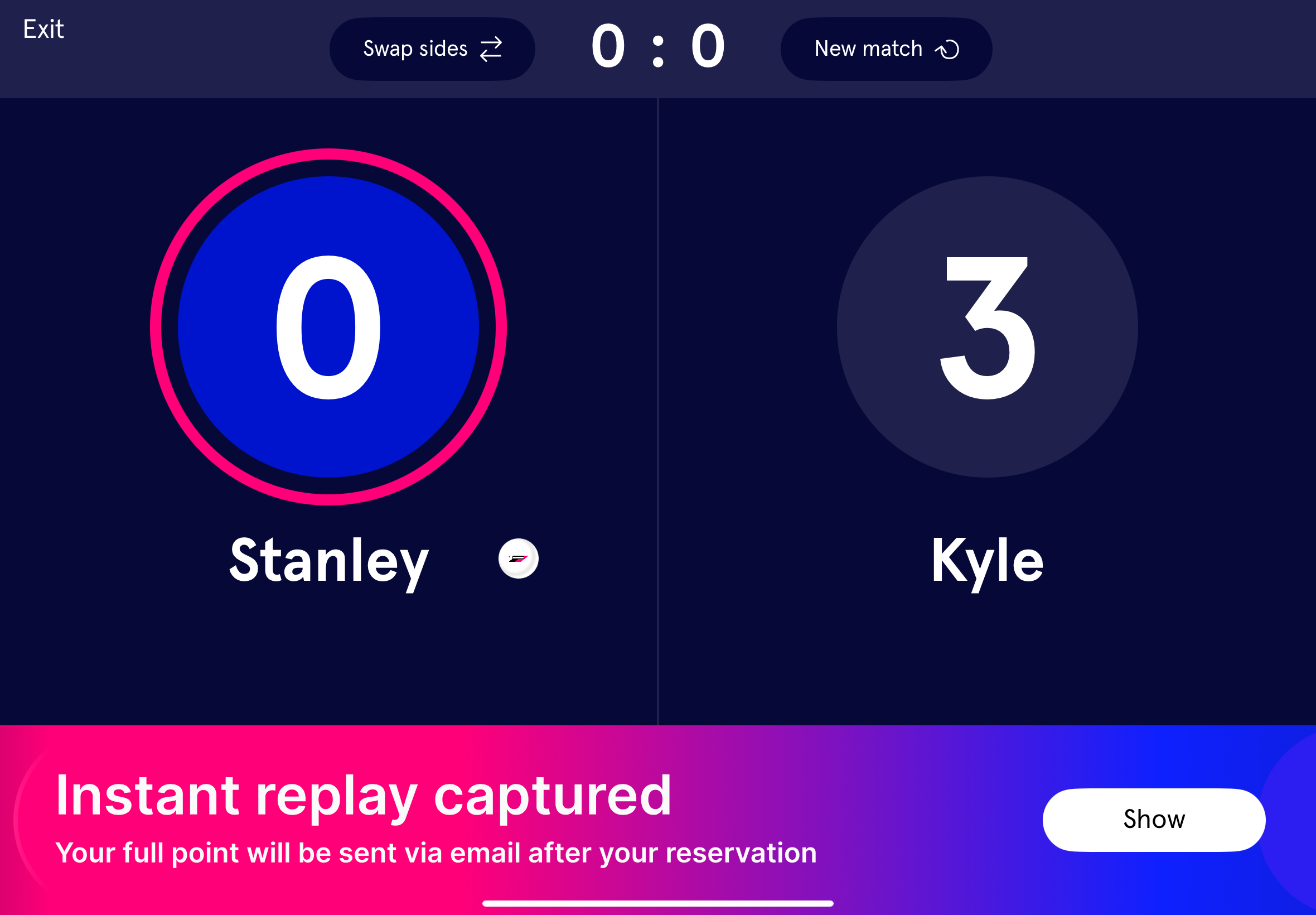 When another Quick Replay is captured with the Play Button, a new banner will appear on the kiosk asking if the Customer wants to “Show” the Instant Replays on the Scoreboard again; this “Show” button is on the bottom right of the kiosk