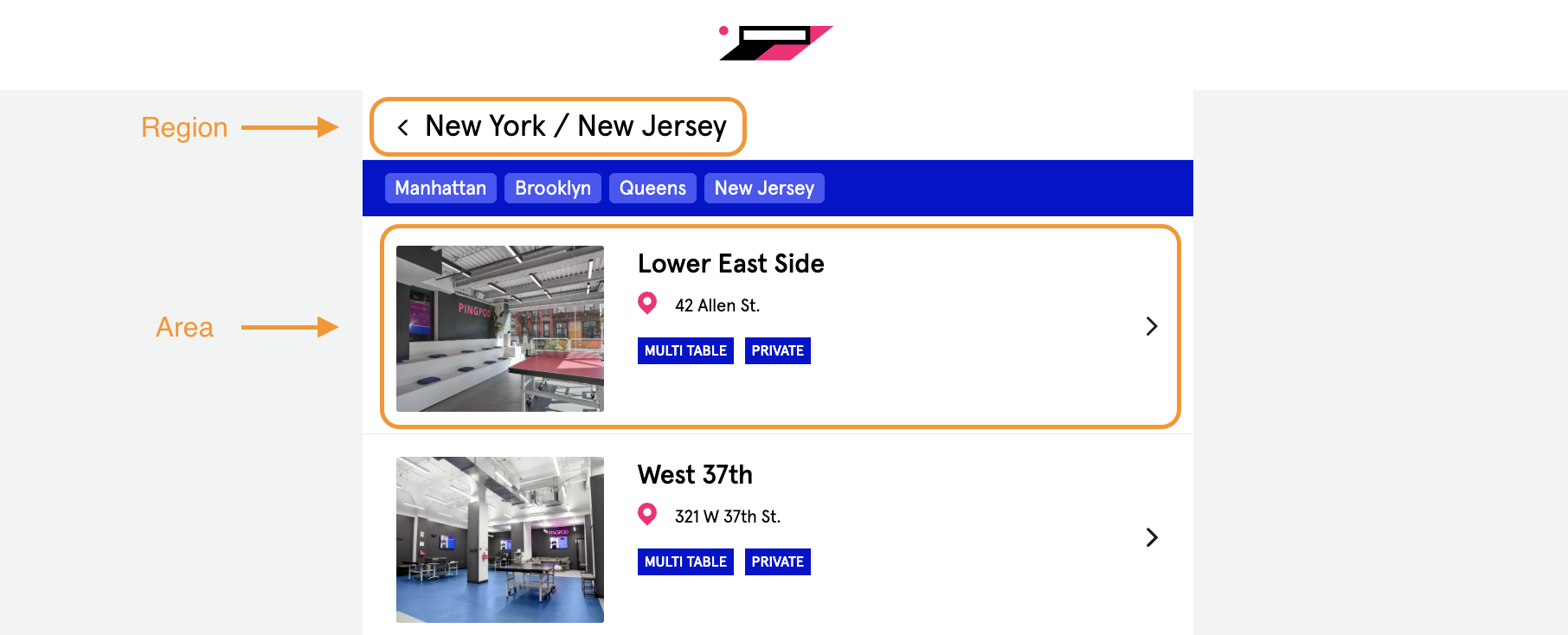 The hierarchy for locations, visible from the front-end (https://yourclubname.podplay.app/book) of the App, are the following: