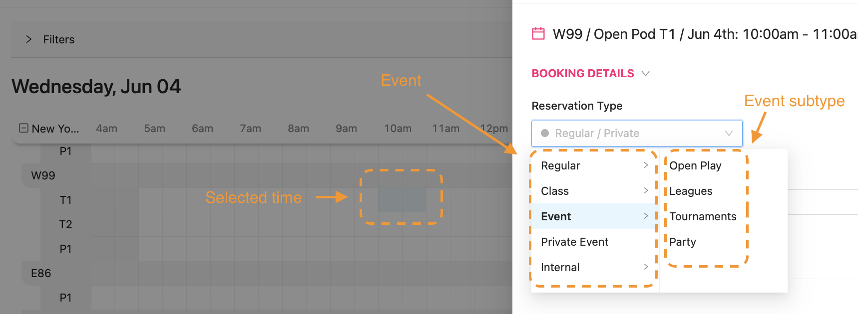The main API for bookings could be a Customer’s private Reservation or an Event type (Open Play, Clinic, League, Private Event, etc.)