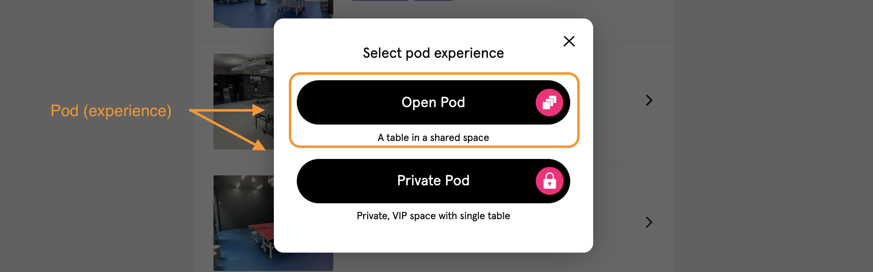 Pod - a section within an Area, often referred to verbally as an “experience;” each Area must have at least one Pod; examples include “indoor court” and “outdoor courts” or “pickleball courts” and “golf sims” (there must be a bookable ”experience” and can be divided up by sport)