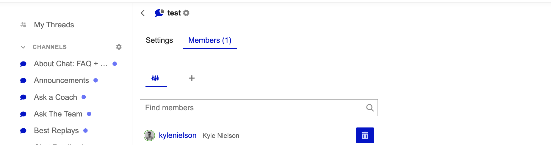Now that a private channel has been created, you can click on the gear icon at the top of the open channel and select the Members tab. In this area, you can search and add Customers to the channel without other Customers finding the channel and joining without permission.