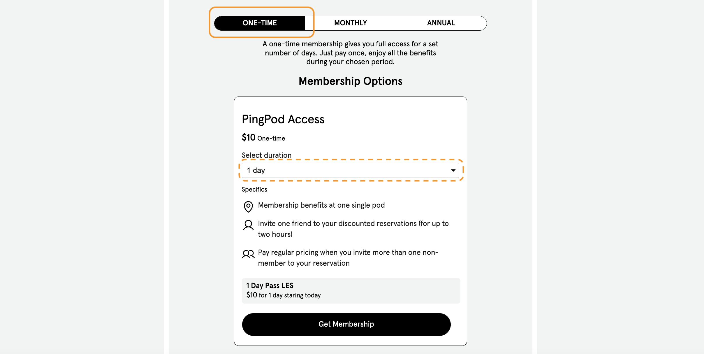 1-day Non-recurring Membership = the Membership perks will last until the end of the day