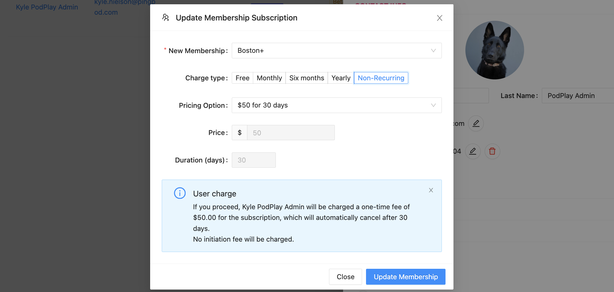 Provide a Non-recurring Membership from the Dashboard