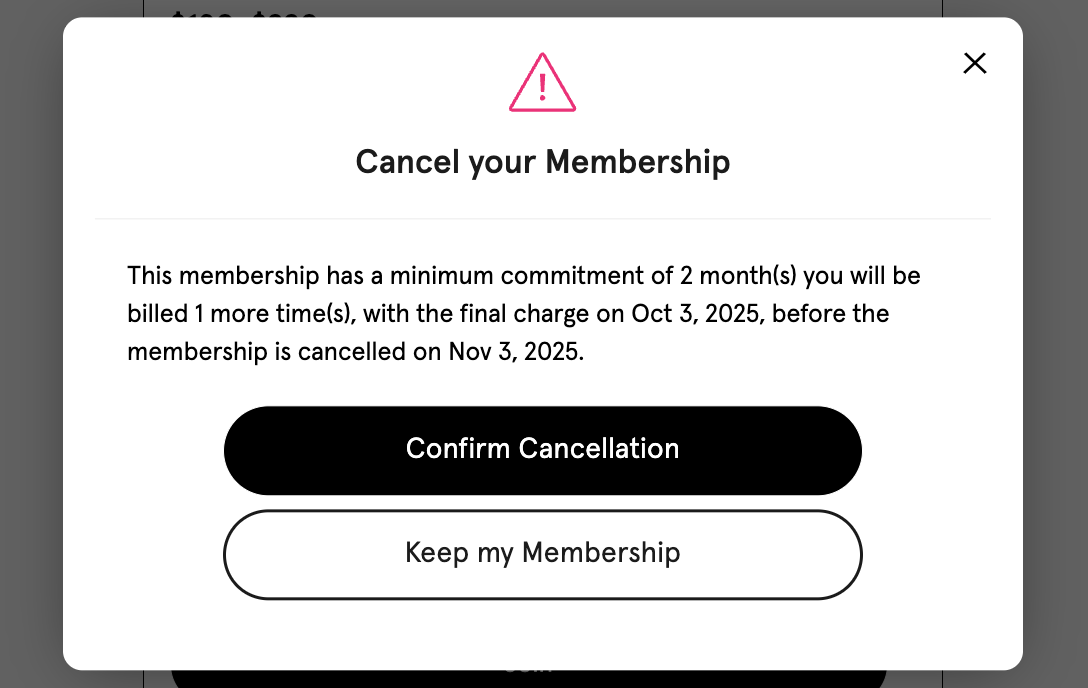 With the Click-to-Cancel button is turned on, the Customer will see a pop-up after pressing the “Cancel Membership” button on the bottom of the Membership page of the App.