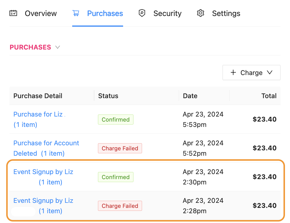If there is an issue after sign-up, an Admin will see a tag labeled Charge Failed in the Event’s Purchase tab.